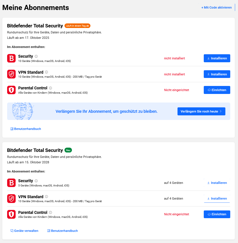 ich besitze eine 14-tägige Testversion und wollte demnächst einen Aktivierungscode erwerben. In den Bewertungen vom 10.11.2021 (Google Play-Store) beschreibt jemand das Problem, dass ein Aktivierungscode, der nicht direkt bei Bitdefender erworben worden ist (sondern über Drittanbieter, ebay etc.), nur nach Kontakt über den Support eingesetzt werden kann. Man kann den neu erworbenen Code zwar in der App eingeben, aber es erscheint nicht die Verlängerung. Wird es jetzt immer noch so gehandhabt oder hat es sich mittlerweile geändert, da ich kein Freund davon bin, ein Abo abzuschließen, aber trotzdem mit dem Produkt sehr zufrieden bin? Bin von Kaspersky zu Bitdefender gewechselt und habe vorher auch immer über Internet-Plattformen neue Lizenzen erworben, die man problemlos einsetzen konnte zum Verlängern.