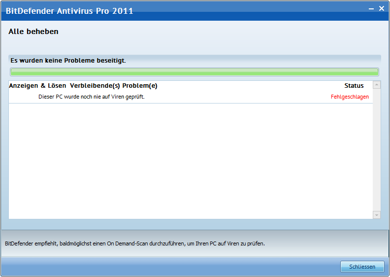 Mein Bitdefender gibt mir immer eine Warnung, dass noch nie ein Scan durchgeührt sei. Nach Fehler "alle beheben" Startet er den Scan, gibt aber ziemlich schnell die Fehlermeldung bei Status "fehlgeschlagen". Auch nach beendetem Scan bleibt diese Meldung und die Warnung. Das macht mich etwas nervös. Irgendwelche Vorschläge?????