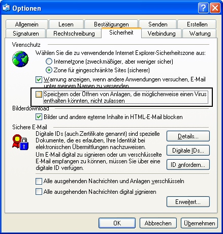 2.Gehen sie zu Extras -> Optionen-> Sicherheit