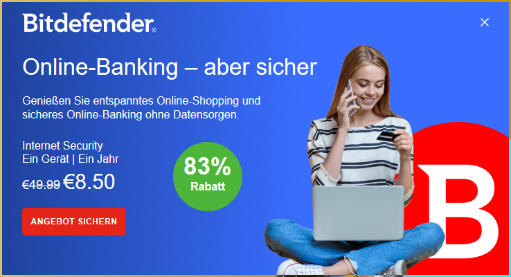 This morning a pop-up appeared on my screen. It appears to be an ad for Bitdefender: one device, one year, normally $74.99, now only $12.75. There's a close box in the upper right corner, but it does not close the popup.