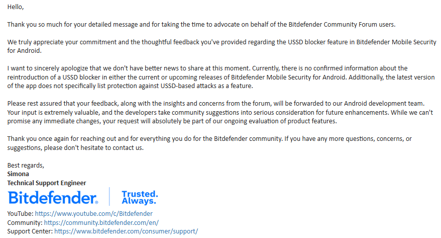 Iâd like to suggest an important improvement for Bitdefender Mobile Security (Android) regarding USSD-based forwarding scams that are becoming increasingly widespread â especially in countries like India, Pakistan, Bangladesh, the Middle East, and beyond.