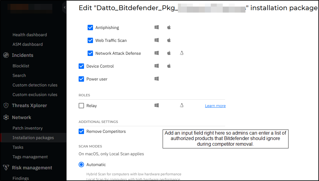 Having a feature that would allow us to ignore certain products (i.e. our EDR) during the competitor removal phase of the BEST installation would be a great way to let organizations adapt to Bitdefender's growing list of competitors. This could be done right in the Gravity Zone installation package designer, as seen below: