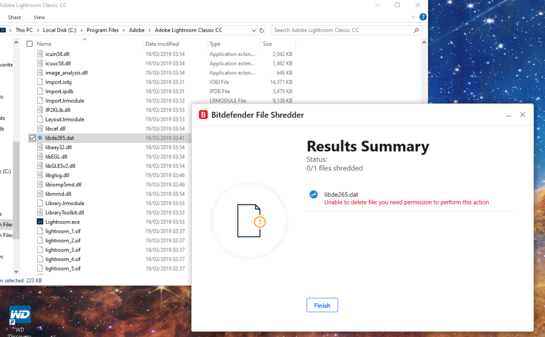 Bitdefender File Shredder could not be able to delete the unwanted file as shown in the attached screenshot below. The unwanted file is in Adobe Lightroom but it does not belong to me as I did not purchase it. According to the scan result of Bitdefender Total Security, the unwanted file has a hidden password. So, please advise and help me to delete it.