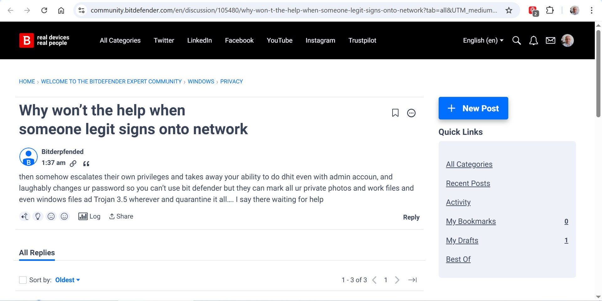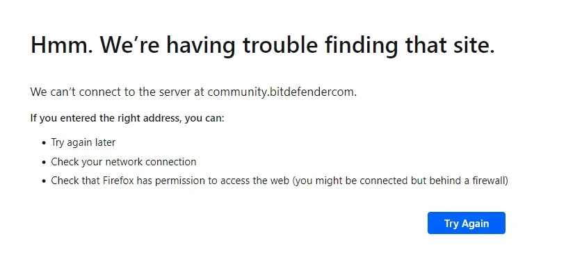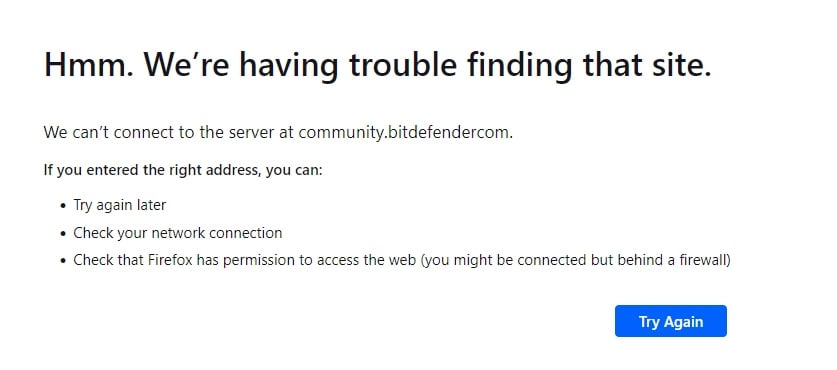 The reason for this that the url is incorrect. It is "community.bitdefendercom". Notice there is no "." between bitdefender and com.
