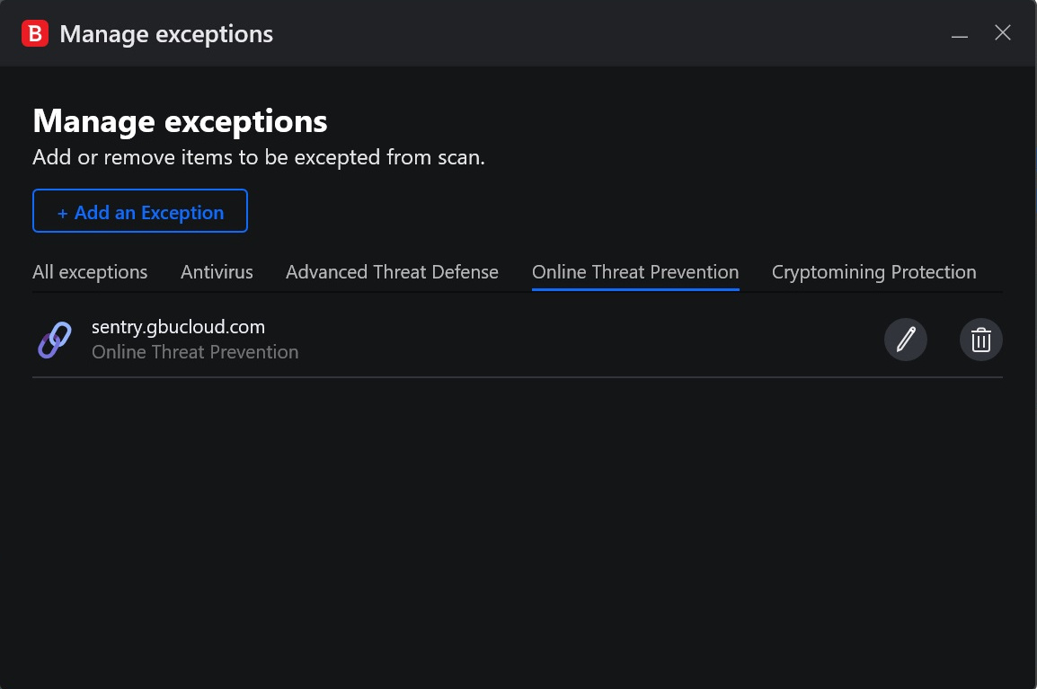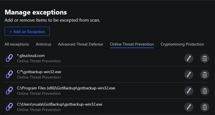 I have had my cloud service for years, and now out of the blue I am getting consistent online threat notifications. I have added the application and URL paths to exceptions that the cloud service needs to access to in order to work properly and those are now getting blocked. I could not find any fix or explanations in the user guide or in the FAQs. I have contacted the cloud service and they verified that the app attempts to reach out to the reported URL when there are problems. I have no logs that can point me to the reason for the notifications for those already under the 'exemptions'.