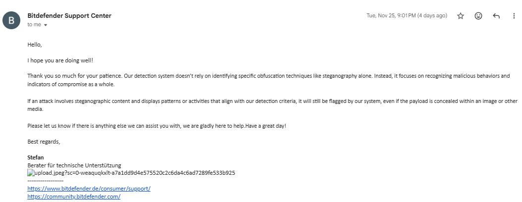 I have shared the link to this specific Bitdefender Community Forum post with Bitdefender support to request information from the Bitdefender malware research team regarding steganography-based threats. The goal is to determine whether Bitdefender includes any components related to steganography detection in both its consumer and business/enterprise products. I will update this post as soon as I receive a reply.
