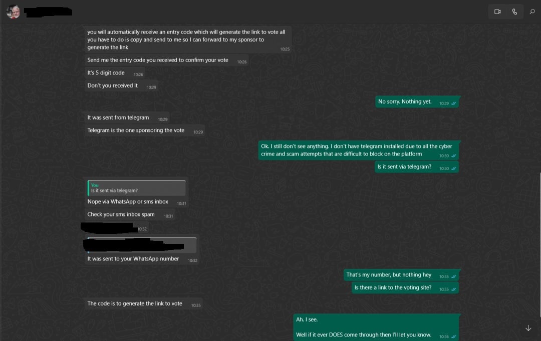 They stated that I would receive a 5-digit code via WhatsApp or SMS and asked me to forward it to them so they could “send it to their sponsor.”