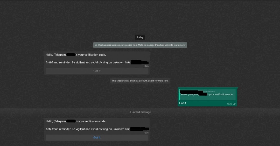 The code did arrive, but I did not provide it. I responded neutrally to avoid tipping off the sender. The request pattern matches a verification-code social engineering attempt, where attackers attempt to gain unauthorized access to WhatsApp or Telegram accounts.