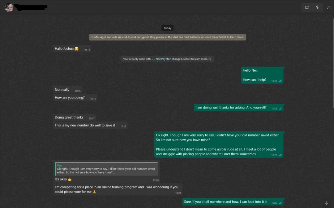 I received a WhatsApp message from the above number claiming to be an acquaintance and stating they were competing for a place in an online training program.