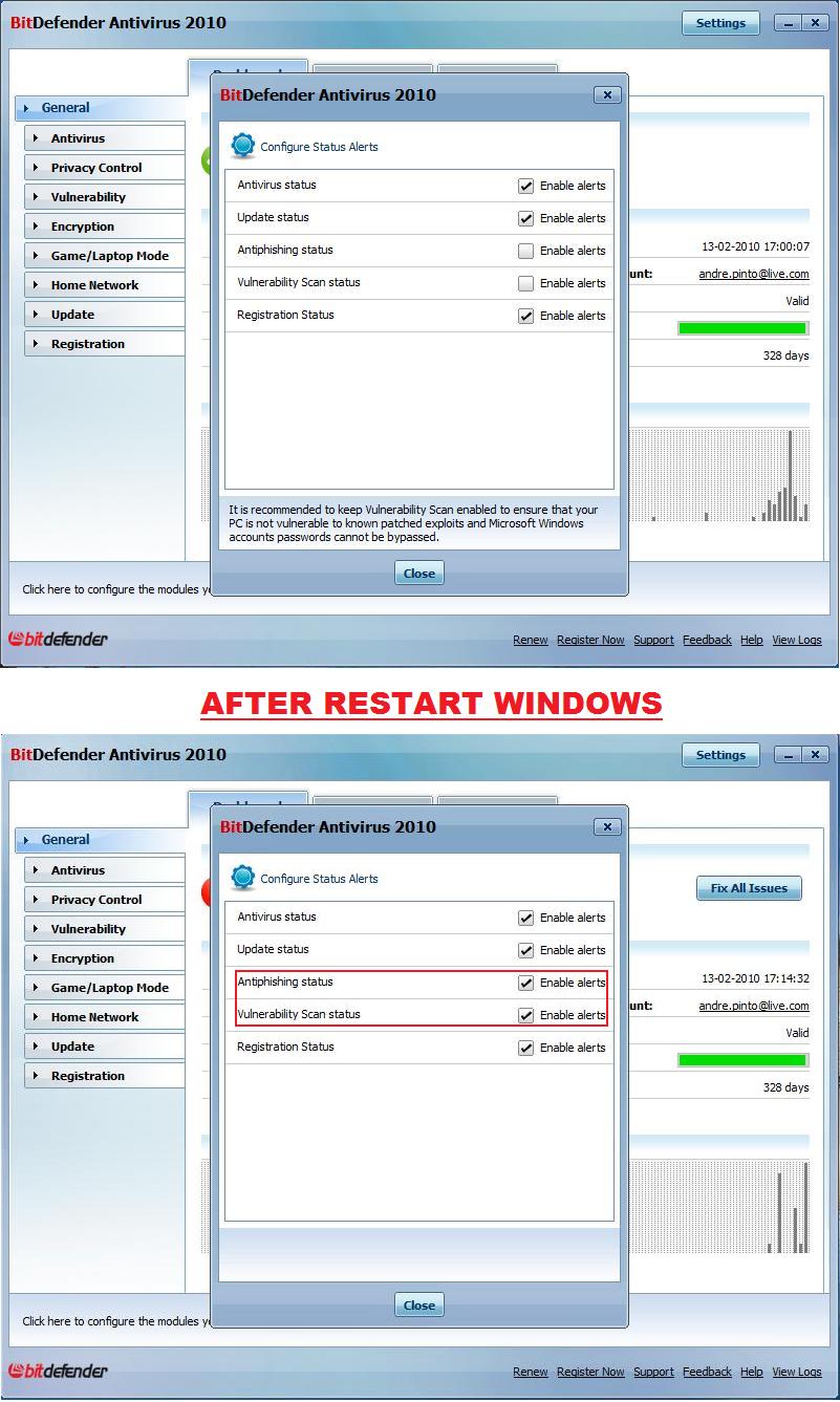 I would like to help me, because I do not want the Bitdefender to alert me whenever I start the PC.