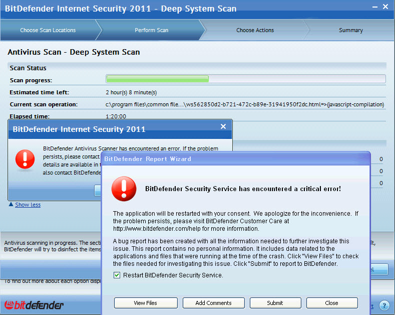 Deep System scan will never complete. I always receive the attached error message and then my hard drive starts working like crazy and there is massive slowdown unless I restart. I am able to run all the other scans normally. This has happened each time i ran the deep system scan. please help.