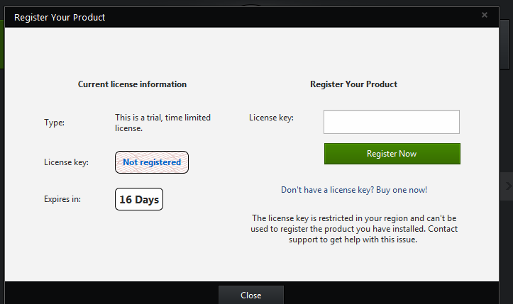 The Licence key is restricted in your region and can't be used to register the product you have installed.Contact Support to get help with the Issue.