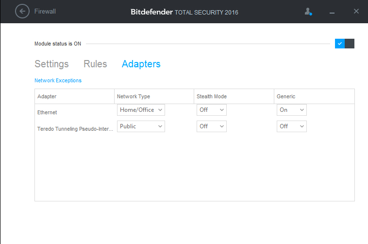 I installed BDTS2016 on two of my computers today (both Windows 10 Pro x64) and I noticed that on both machines, in the Firewall module, under adapters, there is a strange new adapter showing up that I've never seen before. It is called Teredo Tunneling Pseudo-Interface and it shows up for about 30 seconds at a time, then disappears. Can anyone tell me what this adapter is and what the correct settings for it would be? It defaulted to Network Type: Public / Stealth Mode: Off / Generic: Off