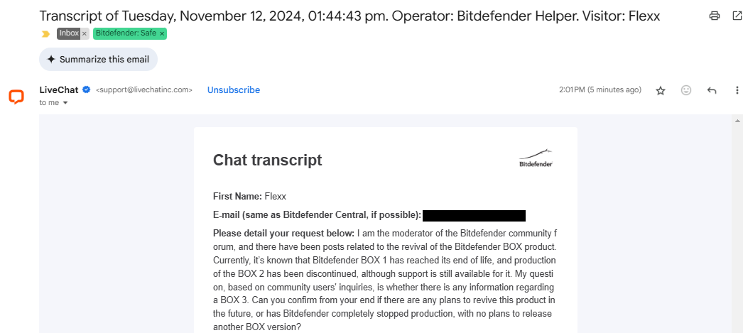 Here is the latest conversation that I had with Bitdefender support just now regarding the Bitdefender BOX product.