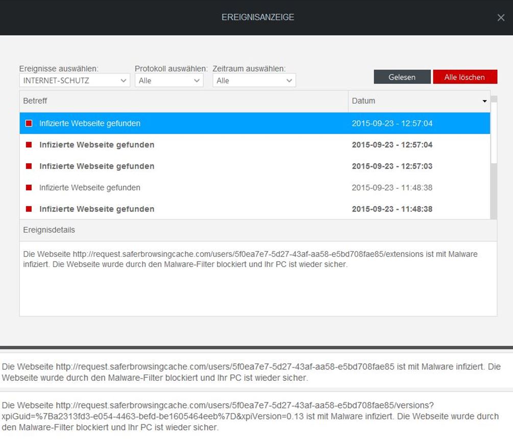 "Die Website http.//request.saferbrowsingcache.com/users/.... ist mit Malware infiziert. Die Seite wurde durch den Malware-Filter blockiert und Ihr PC ist wieder sicher."