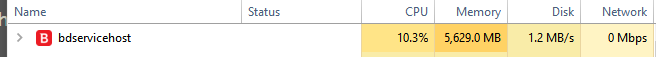 For reference to anyone running into this issue, searching it online - the issue is still there in 2025. If you consider purchasing Bitdefender product - don't. I wake up in the middle of the night to my CPU fans propelling the stand like an airboat from 90% CPU use and 20GB ram hog. It's not supposed to be doing anything, there are no scans in progress, no updates going on, no disk or network usage, and none of the enable/disable controls from UI do anything. Screenshot below is just a start, it would not stop eating resources until PC is restarted. And there are no controls windows user can use to shut off service without rebooting PC. 5 years and how many tickets and engineers "cannot reproduce the issue". If you mined crypto on my machine, it would hog less resources.