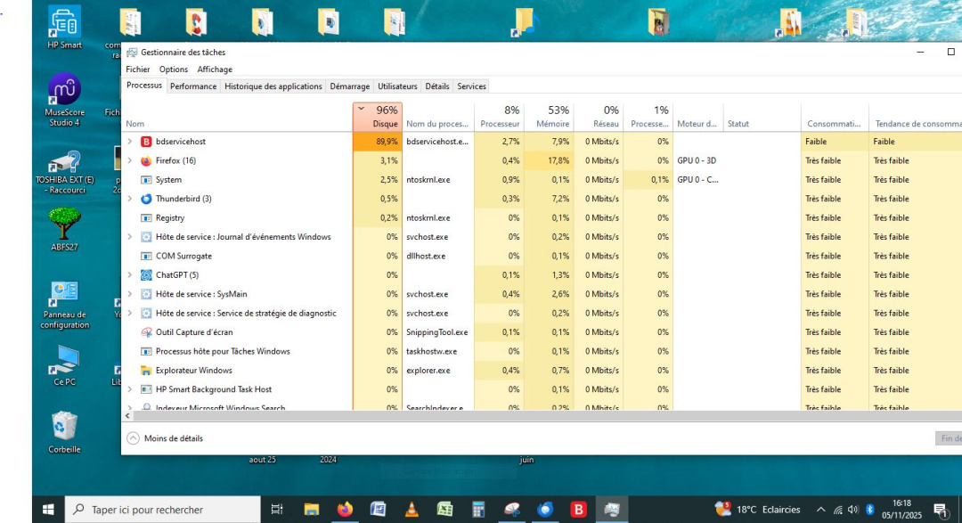 dans le gestionnaire des taches on voit que bit defender mobilise le disque dur énormément. Voir document joint.