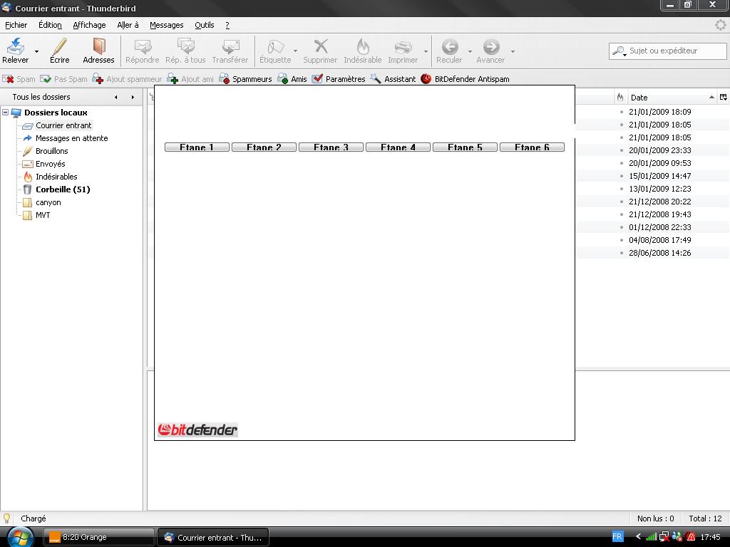 Mais hier malheureusement en voulant ouvrir ma messagerie via thunderbird un bug c'est produit m'empêchant d'acceder a ma boite email , le logiciel se lance bien , mais une fenêtre bitdefender de configuration s'ouvre et la sa plante plus moyen d'avancer , la fenêtre bitdefender n'est pas complet je vois etape 1;2...6 mais pas de texte pouriez vous m'aiguiller sur une solution de repartion