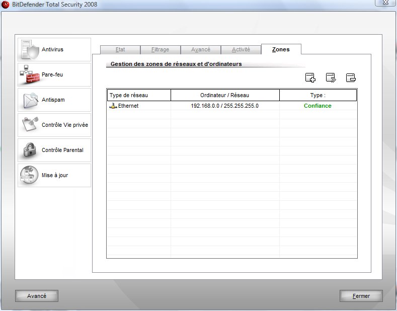 Je suis en train d'évaluer le produit pour mon entreprise et j'ai un problème avec le parefeu : impossible d'avoir accès à internet à moins de le configurer en mode "joueurs". Les autres modes ne fonctionnent pas. J'ai effectué la mise à jour, j'ai appliqué le patch proposé sur le site mais rien n'y fait. Je suis sur un portable sous Vista en connection wifi via une Freebox configurée en routeur.