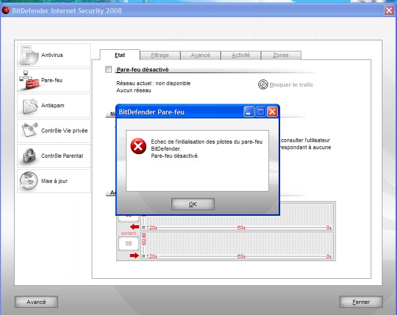 Bonjour, j'ai acheté bit defender 2008 hier, et je n'arrive pas à installer le pare feu. La correction ne donne rien du tout car les pilotes sont impossibles à installer. J'ai vu que plusieurs topics de ce genre étaient déja ouverts, alors afin de ne pas les surcharger j'ai préféré ouvrir un nouveau sujet.