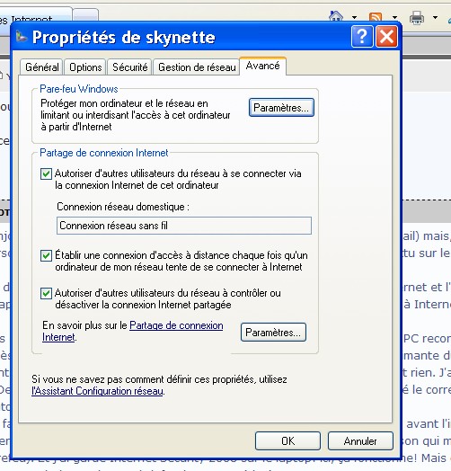 J'ai deux PC en réseau ad-hoc. Le desktop est le serveur, avec l'accès internet et l'imprimante; l'autre, le laptop, y est connecté en wifi. En résumé, je ne parviens pas à accèder à Internet à partir du laptop.