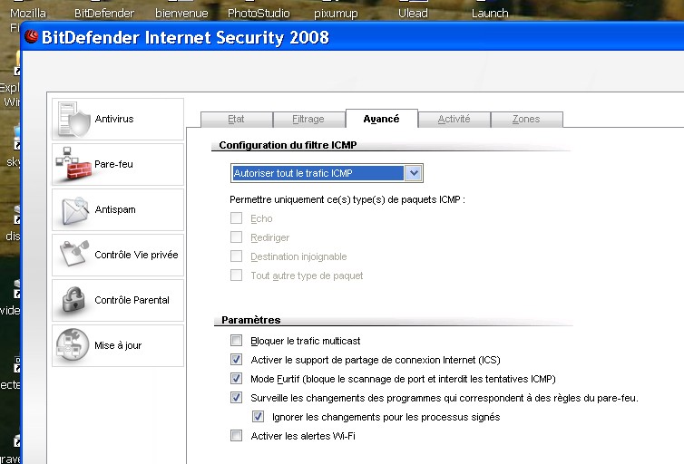 J'ai fait une restauration système du serveur, sur un point de contrôle pris avant l'installation de Internet Security 2008 (ce qui lui a remis Bitdefender 9 mais, pour une raison qui m'échappe, sans parefeu). Et j'ai gardé Internet Security 2008 sur le laptop: ici, ça fonctionne! Mais ce n'est évidemment pas une solution, puisque Bitdefender 9 est périmé.