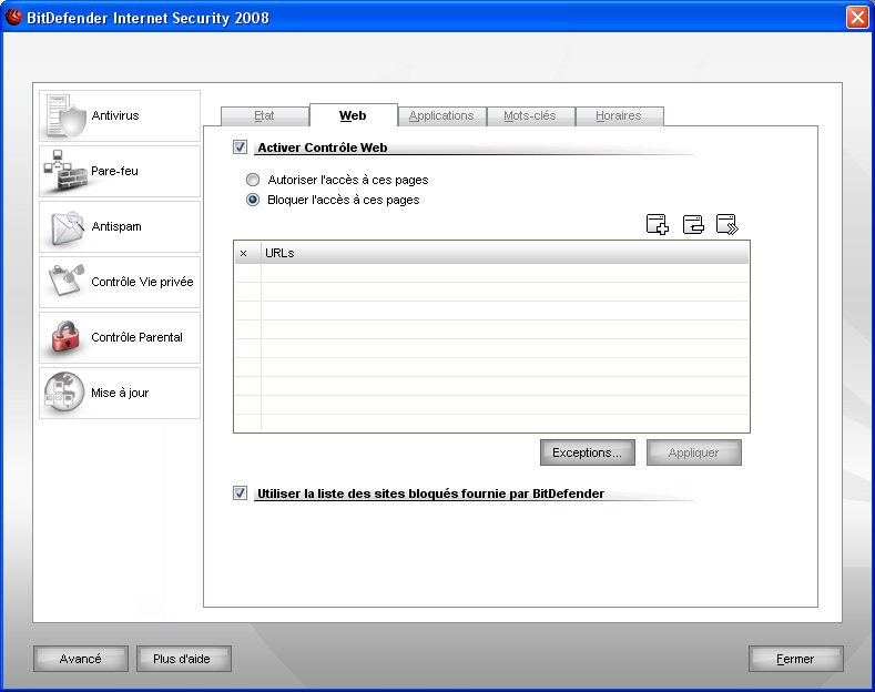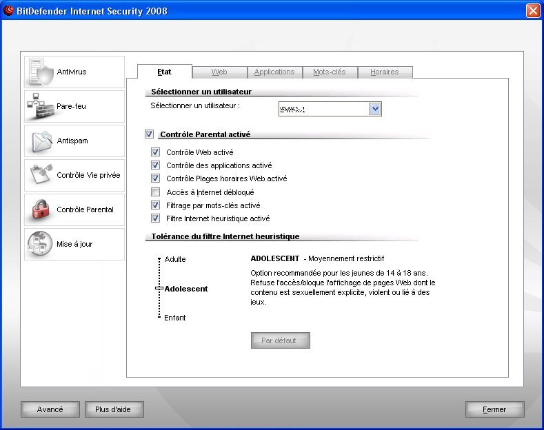 J'ai installé bitdefender internet sécurity 2008 sur un ordi que mes neuveux et nièces (mineures) vont utiliser pour aller sur le net.