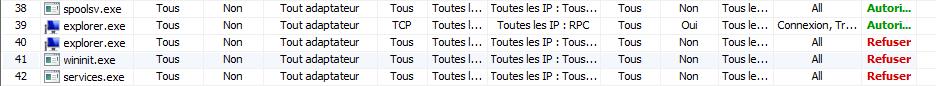 Cependant, quelque chose de bizarre survient dans le paramétrage du pare-feu : après avoir tout installé, paramétré,... j'ai voulu lancer une impression. Rien à faire, rien ne s'imprimait et ce quelque soit l'imprimante choisie (tentative sur 4 différentes). En fouillant un peu, je me suis rendu compte que dans les paramétrages avancés du pare-feu, la ligne SPOOLSV.EXE en adaptateur tout adaptateur était documenté à REFUSER au lieu d'AUTORISER (ce paramétrage s'est fait tout seul).