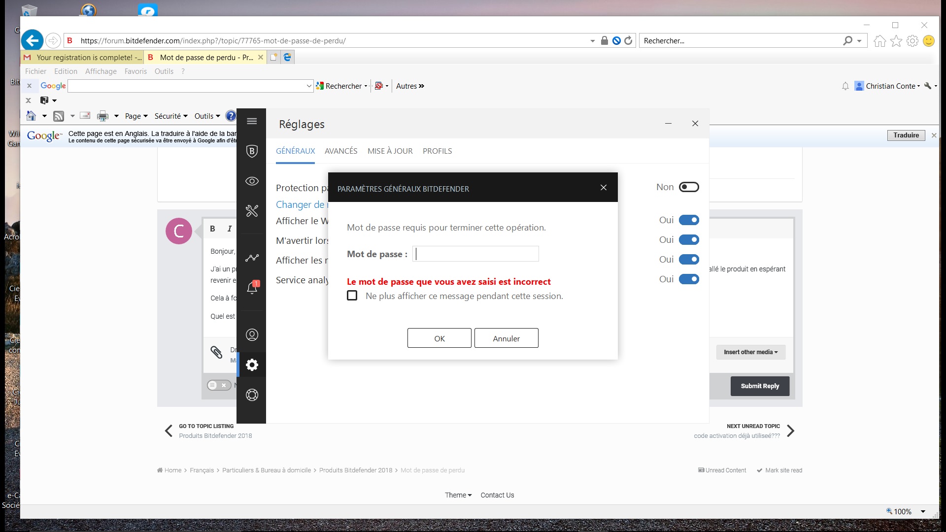 J'ai un problème avec le mot de passe erroné de "Paramètres de Bitdefender 2018 de la protection par mot de passe", comme indiqué en page 20 du manuel j'ai réinstallé le produit en espérant revenir en mode par défaut.