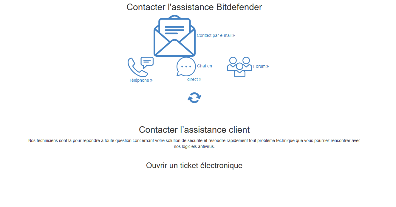 - Impossible de contacter le service client : le site de Bitdefender est tout pourri ce soir, quand je clique sur un truc, j'ai une fois sur deux le message "file not found". Etant parvenu enfin à la section "support", il ne se passe rien du tout quand je clique sur "contact par email" ou "chat en direct", j'ai juste des flèches qui tournent. Je ne peux pas cliquer sur "contacter l'assistance client" ou "ouvrir un ticket" (voir pièce jointe N°2)