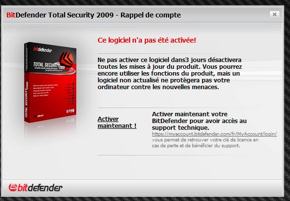 Depuis deux jours, j'ai une fenêtre qui s'ouvre me demandant d'activer mon compte, faute de quoi je ne pourrai plus mettre à jour BD (j'ai trois jours de délai). Or, il me reste 789 jours de licence, et comme je viens de me farcir une infection par un Bagle (voir forum codes malveillants), j'hesite à cliquer sur cette fenêtre, d'autant plus que quelques fautes d'orthographe me laissent songeur sur l'origine de la fenêtre. Merci de me dire si cette opération est légitime.