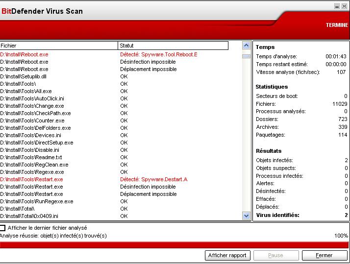 J'ai ensuite analysé le CD de la CM : 2 spywares avec désinfection et déplacement impossible : Spyware.Restart.A et Spyware.Tool.reboot.E.